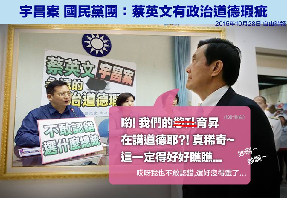 吳育昇談道德,是跟朱立倫談坐好坐滿、馬英九談633一樣嗎? #馬總統也不會為施政不力認錯啊 --- 宇昌案 國民黨團:蔡英文有政治道德瑕疵 http://iservice.ltn.com.tw/2015/specials/election/news.php?rno=1&type=breakingnews&no=1489934