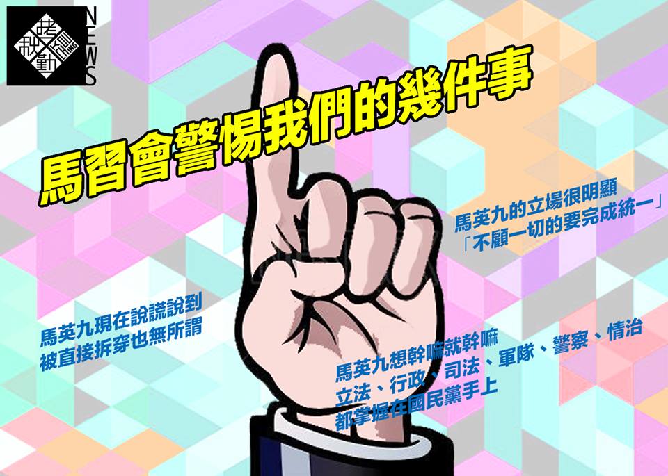 【馬習會警惕我們的幾件事】 . ①沒提各表,只承認一中 爛醉嘻皮笑臉說自己是習的幕僚 馬英九的立場很明顯 「不顧一切的要完成統一」 . ②馬英九現在說謊說到 當場被拆穿也無所謂 反正再爛,藍蛆也不離不棄 . ③馬英九想幹嘛就幹嘛 立法、行政、司法、軍隊、警察、情治 都掌握在國民黨手上 整個臺灣沒有任何人、政黨和制度 可以擋下這場悲劇 . ④馬英九鬼扯對台飛彈, 非針對台灣佈署...... 那是針對誰? 海底的哥吉拉嗎? . ⑤習近平和歐巴馬&梅克爾交手慣了 碰到馬英九這種還沒談判 就跑來倒貼的草包 整個覺得這對手真他媽廢材 . ⑥藍媒跟優質 689 再度死而復生 製造出各種歌功頌德的文章 . ⑦換柱、朱上、馬習會 國民黨透過一連串的小動作 想要逆轉和蔡英文的差距 . ⑧ 1992 年過時的舔中 92 共識 都 2015 了,Iphone 都出到 6S 誰還在用1992年的 B.B Call ? . ⑨臺灣滅國的黃金套餐 KMTers / 300黨工 / 網軍 / 9.2% 冷感小確幸 / 道德潔癖組 / 689 優質假中立選民 / 紅頂台商 / 藍莓 黨國藝人 / 舔共偶像 / RMBers . ⑩明年總統 & 國會大選, 是台灣人能否續存的關鍵一役 是 自由民主的保衛戰 也是台灣獨立的最終戰