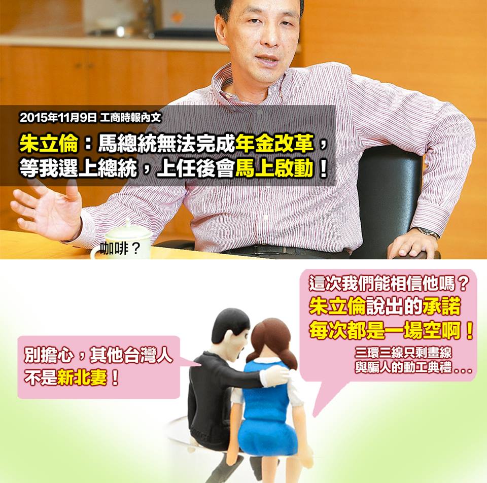 朱立倫說他上任後年金改革會馬上啟動,但是,有三環三線跟做好做滿的前車之鑑,到底還有誰會相信呢~