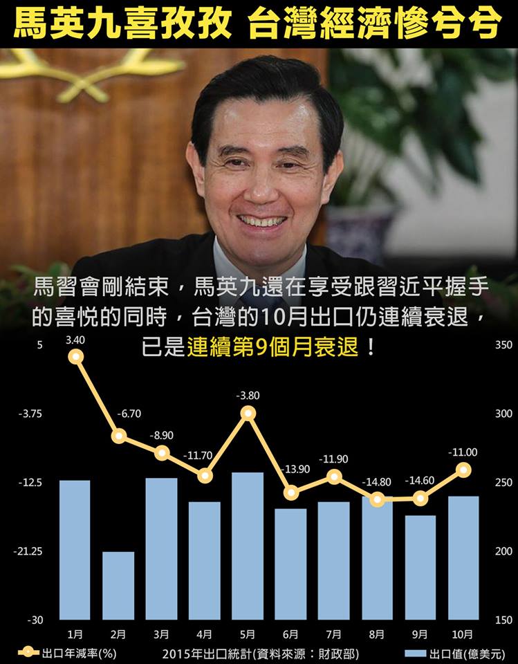 【馬英九喜孜孜,台灣經濟慘兮兮】 正當馬英九跟國民黨還在因為馬習會握了手沾沾自喜,財政部最新公布的10月出口數據,仍是維持雙位數衰退,政府看不到人民最在意的經濟問題,難怪滿意度一直都在谷底啊! --- 出口連9黑 10月年減11% http://news.ltn.com.tw/news/business/paper/931166