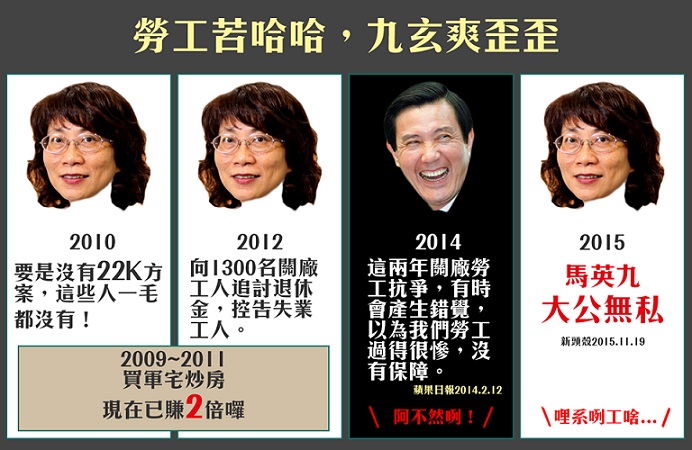 馬英九任內的勞委會主委王如玄,不但是22K、無薪假之母,讓勞工苦哈哈,自己卻買軍宅賺爽爽,怎麼覺得跟賺47萬存48萬的馬英九有點像?難怪要這兩個人要互捧啊!