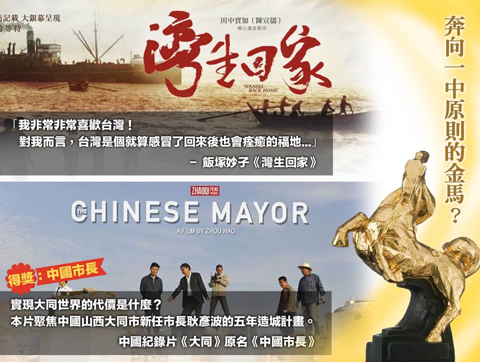 【奔向一中原則的金馬獎?】 剛結束的第52屆金馬獎頒獎典禮,以日治時期台灣歷史題材入圍最佳記錄片的電影「灣生回家」卻遺憾未贏得獎項,而是由原名為「中國市長」的中國電影「大同」獲獎,也引發許多網友對於「灣生回家」未能得獎的同情,不過也有少部份網友質疑為何會將獎項頒給「中國市長」呢? --- 金馬》《灣生》角逐失利 田中實加:遺憾可以釋懷 http://ent.ltn.com.tw/news/breakingnews/1516132 金馬獎第52屆得獎名單完整版 http://www.cna.com.tw/news/firstnews/201511215011-1.aspx