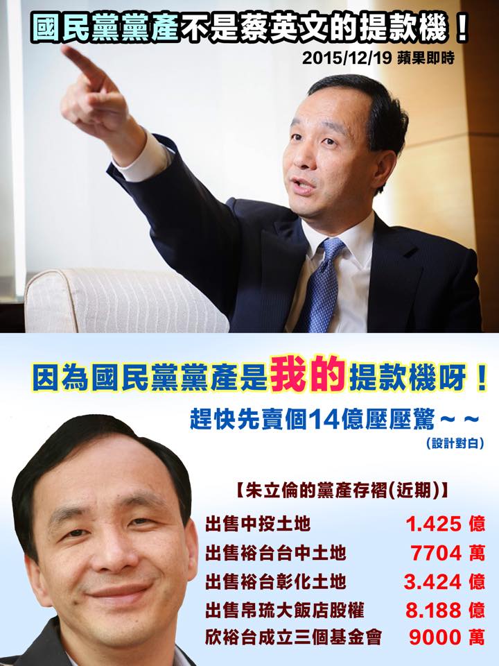 朱立倫說請蔡英文不要把國民黨黨產當提款機,蔡英文又沒有黨證要怎麼領黨產啦!當然是有黨證的朱立倫才能領啊!最近還打算一口氣領快14億呢~ #中午吃飯忘記帶錢可以讓小編順便領一點嗎 --- 黨產已信託 朱立倫批小英把國民黨產當提款機 http://www.appledaily.com.tw/realtimenews/article/new/20151219/756674/ 國民黨選前賣黨產 啟人疑竇 http://news.ltn.com.tw/news/politics/breakingnews/1544736