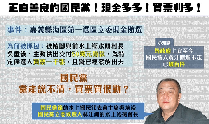 【國民黨不賄選就不會選?】 國民黨才剛被爆出在新竹舉辦萬人「尾牙」餐會的疑似賄選案,賄選疑雲現在連嘉義水上鄉都有!水上鄉代會主席,同時也是林江釧後援會長吳培裕被爆出賄選買票,真的是選舉無師傅,用錢買就有嗎? --- 水上鄉代會主席涉賄選收押/蔡易餘 ︰吳培裕是林江釧後援會長 無法切割 http://news.ltn.com.tw/news/focus/paper/946428 樁腳供出50萬賄選買票事實 國民黨水上鄉代主席收押 http://www.nownews.com/n/2016/01/04/1946271 國民黨賄選清單 http://taiwan-fugue.blogspot.tw/2015/12/blog-post_22.html PTT網友整理賄選 http://disp.cc/b/1022-7R1q