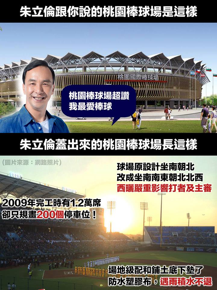 【朱立倫真的很愛棒球,只是不小心把桃園球場蓋得很爛而已】 有去過桃園棒球場的人一定知道坐在一壘看台那側,傍晚時西曬相當嚴重,為何會有這樣的問題呢?有立委指出這樣的狀況是當初為了搶食擴大內需的經費所「變更設計」的。除方位不當外,還有嚴重的排水問題、停車場不足。但朱立倫卻說批評他的都是一日球迷? #好啦原來美國大聯盟道奇隊也是一日球迷喔 #恰恰說在桃園球場打球某些時刻確實會看不清楚球也是一日球迷 --- 桃園棒球場鬧國際笑話? 段宜康:朱應向球迷、球團道歉 http://news.ltn.com.tw/news/politics/breakingnews/1564191 「球場爭議」 朱立倫遭批:連一日球迷都不配 http://news.ltn.com.tw/news/politics/breakingnews/1487908