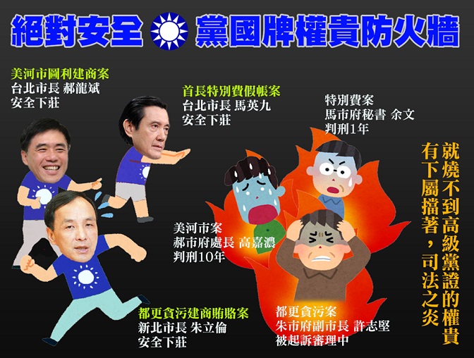 【最耐燒的黨國權貴防火牆…】 當然是下屬啦!辦國民黨的弊案,也會遇到玻璃天花板耶。高級人士都不會有事情,有錯一定都是they的錯! 新聞來源: ・涉收400萬、金條、名錶 前新北副市長許志堅將被起訴 http://www.storm.mg/article/74564 ・特別費唯一受罰者 余文:出獄接到馬英九電話 http://bit.ly/1YNvVVa ・美河市案圖利日勝生 北市捷運局前官員重判10年 http://udn.com/news/story/8672/1407441