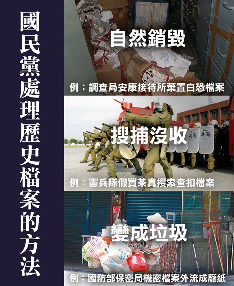 【國民黨對待歷史檔案的方法】 放在政府被當垃圾,流落民間又要被查,國民黨最想要的處理方法就是讓這些歷史資料消失吧? 參考資料: 密件變廢品又遭索 民眾莫衷一是 http://udn.com/news/story/6656/1544572 安康接待室荒廢 調查局打包資料 http://news.cts.com.tw/cts/politics/200903/200903190263264.html 臺白色恐怖檔案曝光 滿屋史料見證當年 http://big5.huaxia.com/thpl/jwgc/2009/03/1359525.html 學者:白色恐怖檔案 被拾荒者撿到 http://news.ltn.com.tw/news/focus/paper/966168 民進黨推動制定政治檔案法 http://news.ltn.com.tw/news/politics/paper/963268