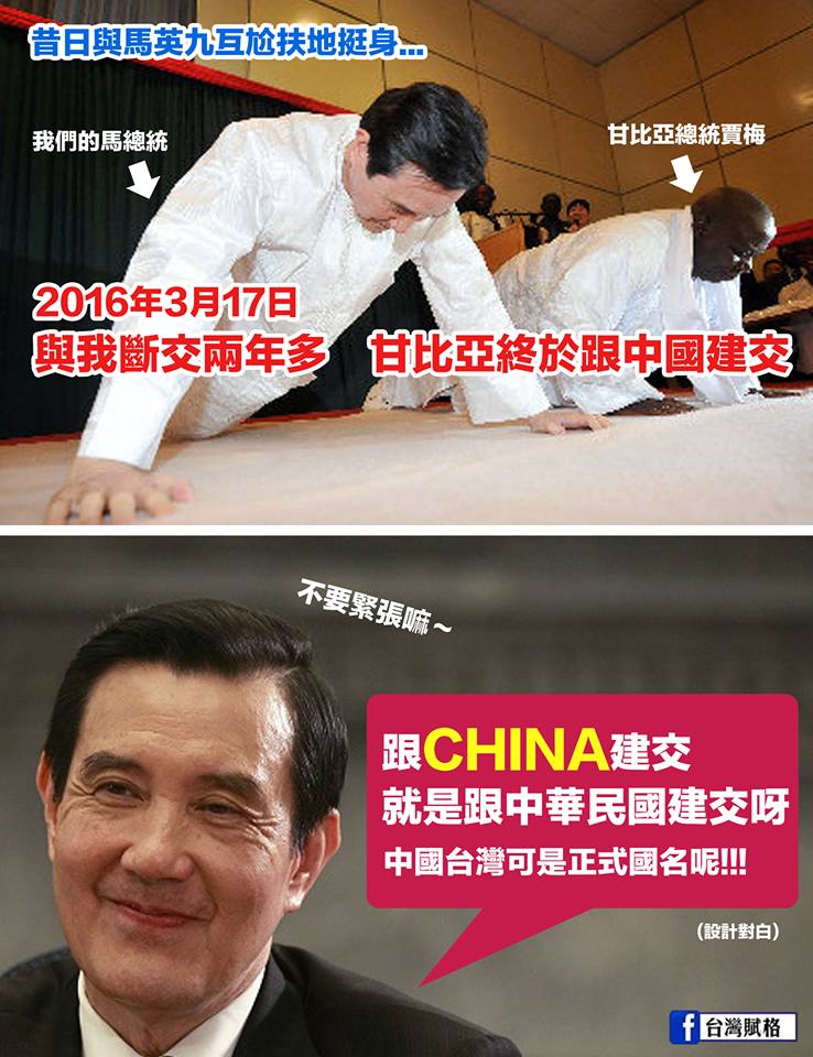 甘比亞跟中國建交,外交部表示遺憾?馬總統在說你們有沒有懂?甘比亞跟CHINA建交就是跟中華民國建交,不要擔心啦! #中國台灣就是正式國名 #扶地挺身外交的一大進步 --- 與我斷交兩年多 甘比亞終於跟中國建交 http://goo.gl/PxBIhH 馬英九曾與甘國總統尬伏地挺身 並獲贈7頭牛 http://goo.gl/C0sqMx 甘比亞與中國建交 外交部:遺憾 http://news.ltn.com.tw/news/politics/breakingnews/1635782 被稱「中國台灣」總統 馬:是正式國名 http://news.ltn.com.tw/news/politics/breakingnews/1635463