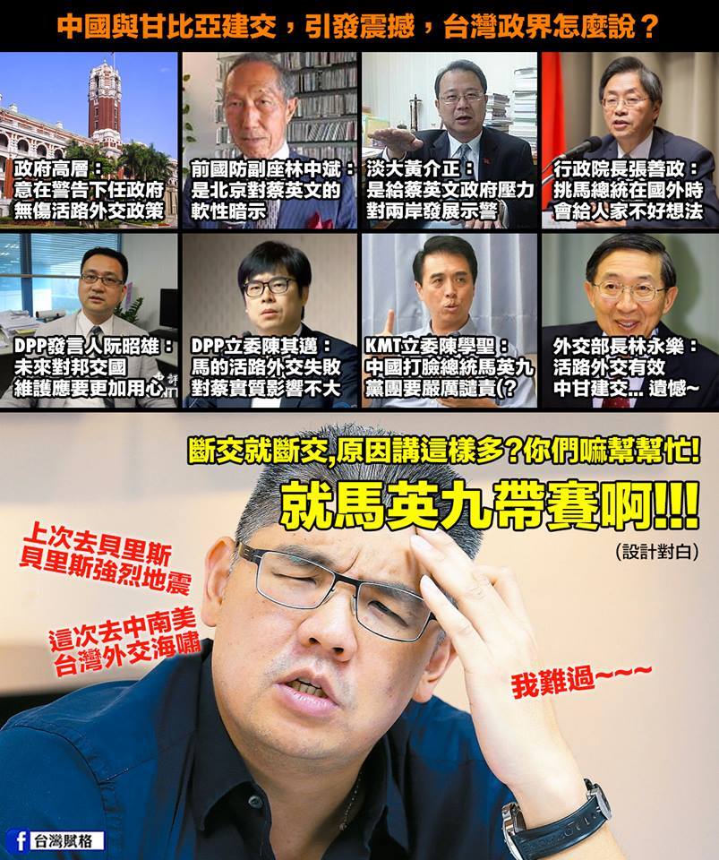 中國跟甘比亞建交的原因難道是因為..... #每次都這麼剛好啊 #世界平安 --- 帶衰馬!上次訪貝國遇地震 這次遇外交海嘯 http://news.ltn.com.tw/news/politics/breakingnews/1636008