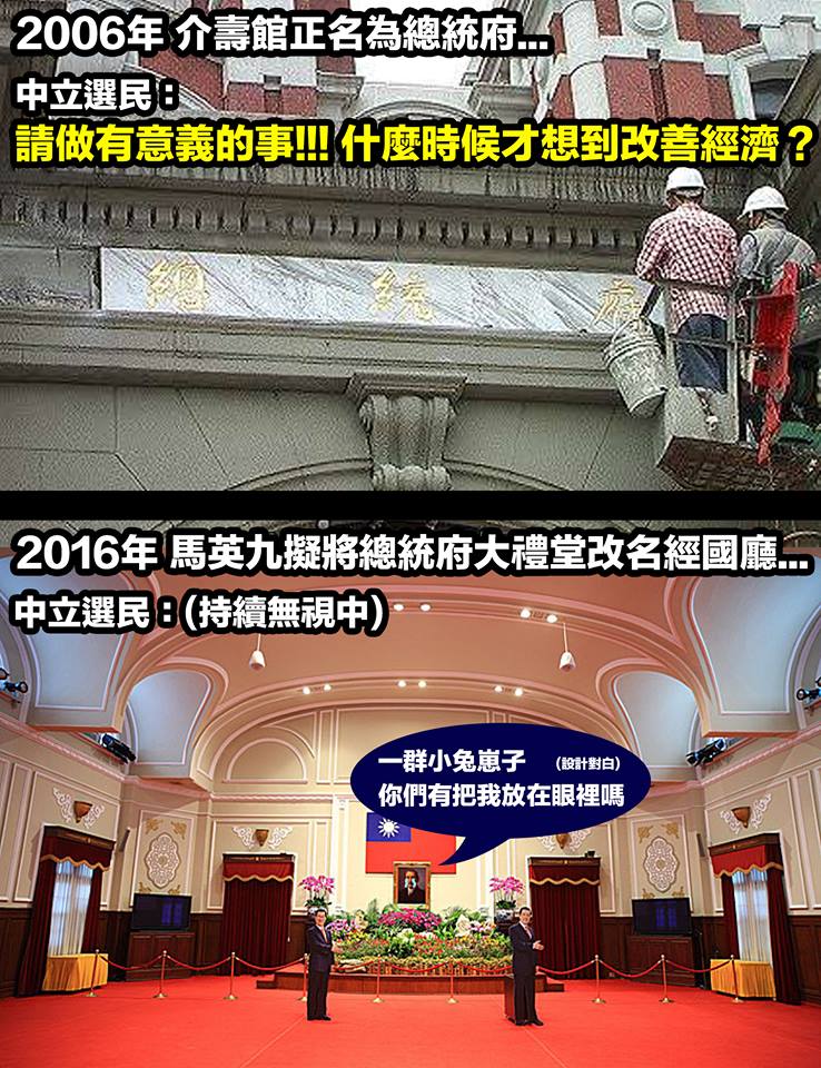 中立選民的標準: 民進黨執政把介壽館改成「總統府」→沒有其他事情可以做了嗎? 國民黨執政把大禮堂改成「經國廳」→(無視中 好棒棒) #英九你真的沒有其他有意義的事情可以做了嗎 --- 「經國廳」遭撻伐 府方:為讓國人了解蔣經國 http://news.ltn.com.tw/news/politics/breakingnews/1640661 台灣總統府正名 泛藍黨團:請做有意義的事 http://www.epochtimes.com/b5/6/3/25/n1266119.htm
