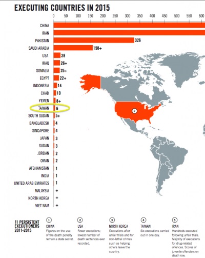 死刑排行榜使台灣國得到「正名」,並與中國及其他獨立國家並列。 若以人口比例計算,台灣是勝過美國的。圖中下方註解 ④ 說明台灣在2015年 槍決了6名死囚。這是法務部長羅瑩雪的功勞,也是馬政府政績的一部份。