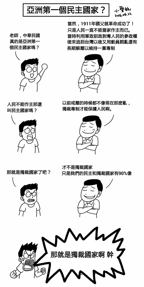「破除黨國詐騙神話001」 中華民國是亞洲第一個民主國家? http://www.hi-on.org.tw/bulletins.jsp?b_ID=69114 簡單說,從時間上來看不是第一個。成立之後也絲毫沒有民主,真不知道哪來的臉講這句話?那為什麼獨裁了七八十年之後會慢慢有民主呢?那就是另一個故事了。