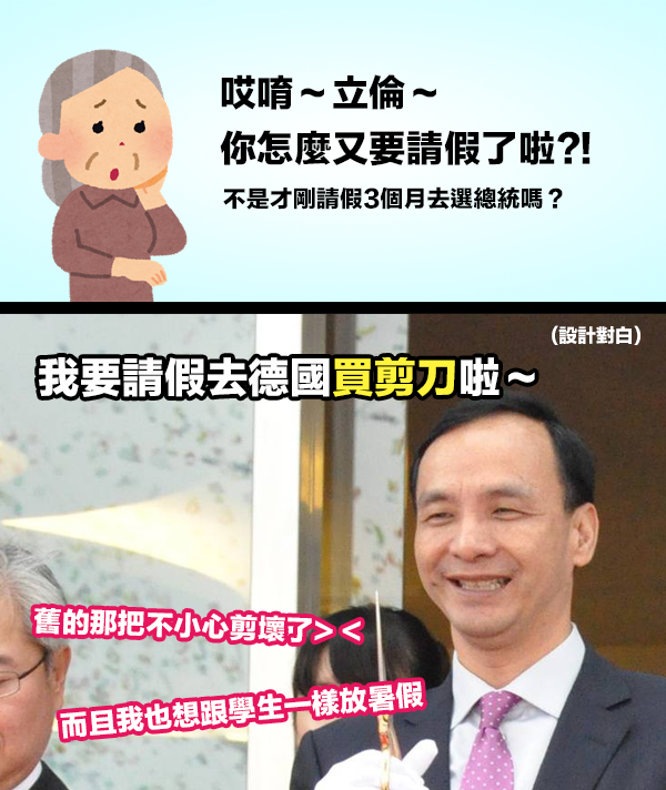 【假可以這樣請了又請 請了又請的嗎?!】 新北市長朱立倫前陣子才剛請了三個月的長假去選總統,現在又要請假去德國了。但是,氣象局說颱風要來了耶!市長確定職務代理人真的沒問題嗎? #選舉請假暑假也要請假 #難道是為了去德國採買剪刀回來繼續當剪綵王嗎 #新北市長唯一技能 --- [新聞] 朱立倫神隱多日 原來是休假自費參訪德國 https://www.ptt.cc/bbs/Gossiping/M.1467646543.A.7F6.html