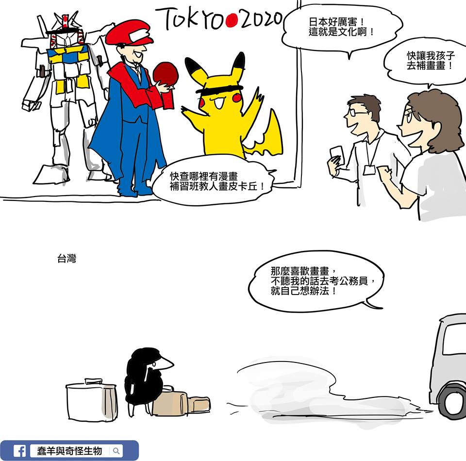 從日本發表 TOKYO 2020奧運影片,滿滿的軟實力、文化露出,充分表現了日本的特色讓全世界為之驚艷 讓我想起了很久以前的事情,那段我堅持畫畫的日子 我很少說這件事,因為在臺灣畫漫畫並不快樂。 - 小時候,因為選擇了美術相關科系的學校 被反對,被親戚在年夜飯的餐桌上輪流羞辱 他們說,畫畫會敗光祖產、讓家族蒙羞 (我看著我的畫被一腳踩過) 最後我沒有放棄,就把我丟掉了 身無分文的到了一個陌生的地方,過著一個星期只吃一餐的日子 只因為想要畫畫,因為很淒楚知道自己想要作什麼 我忘記當時怎樣撐過來的,總之 我學會了怎樣活下來 學會這個社會的規則 所以 我拿到了名校的畢業證書 找到一份好工作 (為了議題東奔西走、沒收入的那段日子更是不能被理解) 跟總統合照 出書 接受採訪 上電視 … 現在 他們和親戚,驕傲地跟人說,他們是我的親人 那個蠢羊現在很紅,以前我就知道他長大後很有出息,是個特別的孩子 我不恨,因為我懂得笑了 我不太常說這個故事,而事實上我也已經好久沒有想起那段苦日子,因為現在的我已經比別人幸運太多,有很多朋友,和形同家人的同事,即使漫畫家的苦差不多都吃過一輪,但我真的已經很幸運 當你的朋友、家人、孩子,跟你說,他喜歡畫畫 他喜歡創作 他喜歡唱歌 如果他真的清楚他非常擅長什麼,就讓他試試看 (除了讀書以外都是壞東西、浪費生命?) 他選擇了什麼,就讓他為自己的人生負責 (失敗並不可怕) 數十年之後,他會為自己找到自己的世界 我 真的希望,在臺灣這裡 不要再有下一個喜歡創作,卻被迫放棄自我的孩子了