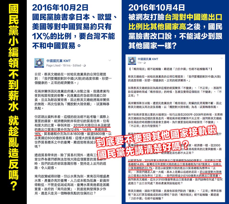 國民黨的臉書拿出數據說台灣的出口要跟其他國家看齊,被網友質疑台灣對中國出口比例太高,是不是要減少到和其他國家一樣?被網友打臉後,國民黨臉書又說不可以減少到跟其他國家一樣? 到底要不要跟其他國家看齊阿?難道是因為最近柱柱姐發不出薪水,小編也跟著混亂了嗎? 國民黨發文嗆小英 網友提數據酸:自打嘴巴! http://news.ltn.com.tw/news/politics/breakingnews/1845634