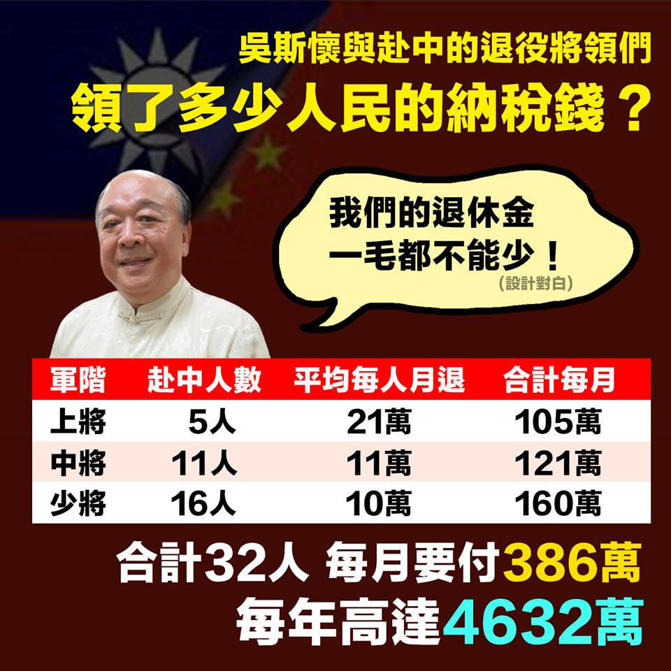吳斯懷跟三十幾位退役將領,在台灣坐領高額退休金,卻跑到中國去聽習近平訓話,光是這一趟去的這幾位退役將領,一年就要花掉台灣人快要5千萬,還說自己是「問心無愧」,怎麼不問問台灣人能不能接受呢? 習近平講話中 赫見吳斯懷等我國退將在座 http://udn.com/news/story/1/2099987