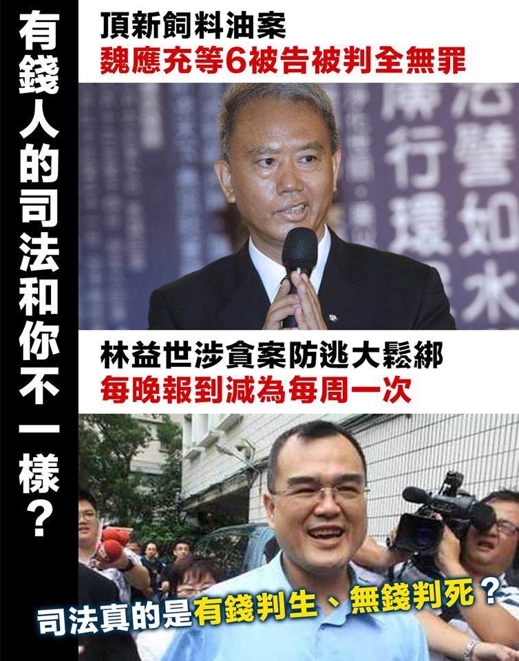 【有錢人的司法和你不一樣?】 頂新魏應充讓台灣人吃黑心油:無罪。 馬政府林益世貪污美金多到要用金桶燒:出來趴趴走。 長期以來有這麼多不可思議的案例,難怪民眾會覺得台灣司法是「有錢判生、無錢判死」,看來總統沒講錯阿,司法改革難到不迫切嗎? 太扯 頂新魏應充6人無罪 https://goo.gl/x64TgN