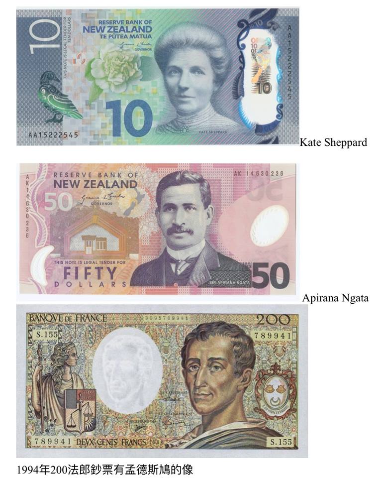 再舉紐西蘭為例:紐西蘭雖然還有英國伊莉莎白女王的圖像(因為屬大英國協),但是十元紐幣的圖像用的是一位女性,紐西蘭傑出的女權運動家Kate Sheppard;五十元鈔則用一位毛利人像,他是著名律師、曾任國會議員,為毛利文化和語言極盡心力的Apirana Ngata。女性及少數的毛利人能在白人為多數的紐西蘭錢幣上如此受到重視,足堪我們取法。