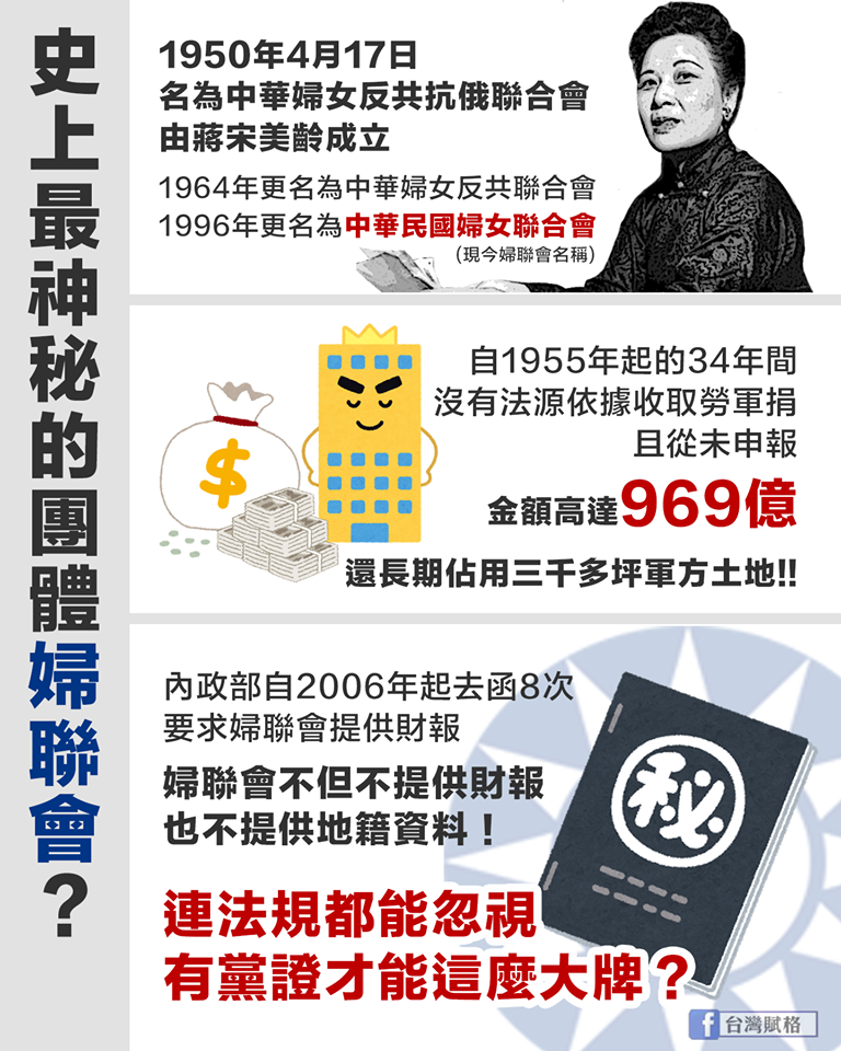 【連財報都不給你看的神秘婦聯會?】 1950年4月17日蔣宋美齡成立的「中華婦女反共抗俄聯合會」(1996年時改名為中華民國婦女聯合會,也就是現在所稱的婦聯會),被質疑長期以來以沒有法源依據的勞軍捐為收入,金額高達900多億,甚至還有佔用國家土地的情形。 雖然國民黨或婦聯會一直聲稱自己與對方沒有關係,但從過去的資料來看,除了婦聯會疑似有神秘特權讓他們收勞軍捐之外,2015年,國民黨籍的前立委鄭汝芬接任婦聯會彰化縣分會主委的就職活動相關文字與照片就擺在國民黨的官網上,照片中除了可以看見「中華民國婦女聯合會彰化縣分會主任委員就職暨各支會主委授證典禮」的紅布條外,台上還陳設了中國國民黨黨旗。 如今黨產會要清查婦聯會相關財產,主管機關內政部向婦聯會調閱資料,卻都遭到婦聯會拒絕!難道婦聯會的神秘力量,大到可以不按照規則來嗎? 婦聯會不是國民黨附隨組織?一張照片馬上打臉! http://www.appledaily.com.tw/realtimenews/article/new/20160309/811764/