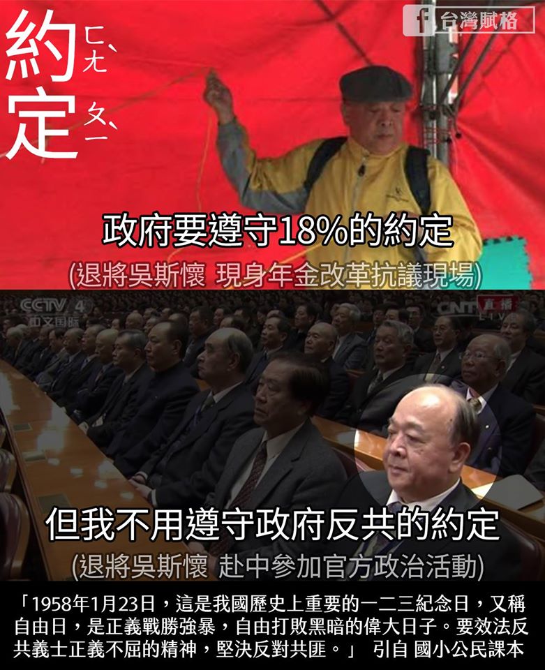 【約定有兩種】 反改革者說,18%是政府的約定。難道反攻大陸、反共的約定就不算數了嗎? #說好的反攻大陸呢 #以前反共現在舔共 秋惠文庫:123自由日的由來 https://www.facebook.com/FormosaMuseum/posts/950078231696408 123自由日的由來 看看以前的公民課本怎麼說 http://news.ltn.com.tw/news/life/breakingnews/1582140