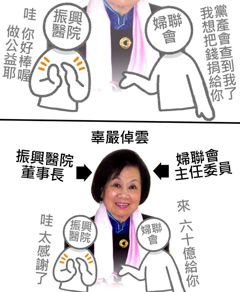【左手捐右手】 什麼叫做左手捐右手?請看圖。 #妳再演啊 黨產會:婦聯會現金定存高達370億,可開三家銀行 http://www.peoplenews.tw/news/09aec277-c5e6-4899-9d8b-c295e97980ae 60億給振興醫院 挨批「左手捐右手」 http://www.appledaily.com.tw/appledaily/article/headline/20170218/37555853/