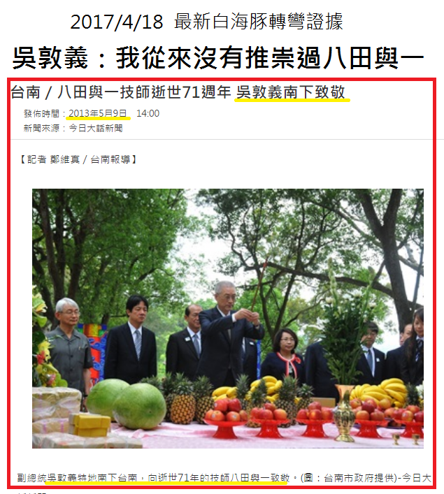 白海豚自然有牠生存、游水的路徑,牠也會轉彎的阿,牠既然在台中港那個海堤,牠都能轉彎,那何以在彰化就不能轉彎? 中央社即時新聞 2017/04/18 吳敦義:我沒有推崇八田與一 http://www.cna.com.tw/news/aipl/201704180145-1.aspx 今日新聞 2013.05.08 八田與一技師逝世71週年追思會 副總統吳敦義主祭 http://www.nownews.com/n/2013/05/08/277833