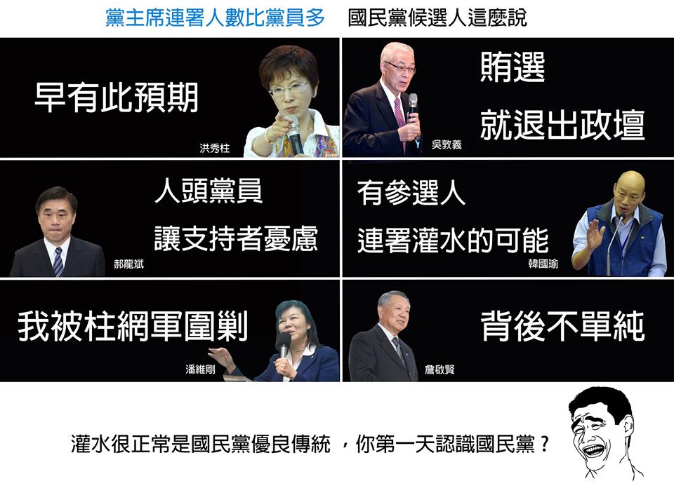 選黨主席灌水有什麼了不起的,又不是第一次了。 誇張!國民黨主席選舉連署份數多出黨員數24萬 http://news.ltn.com.tw/news/politics/breakingnews/2039924 郝龍斌:黨內互打、人頭黨員讓支持者憂慮 http://talk.ltn.com.tw/article/breakingnews/1210773 連署書爆量 洪秀柱:早有此預期 https://money.udn.com/money/story/7307/2413903 逾22萬連署書 吳敦義登記參選黨主席 賄選疑雲纏身! http://talk.ltn.com.tw/article/breakingnews/2003492 六陣營連署書加總爆量 韓國瑜疑兩種可能 http://www.nownews.com/n/2017/04/18/2487634 洪秀柱出席黨團政見會潘維剛:我被柱網軍圍剿 https://udn.com/news/story/1/2391366 國民黨員人數倍增 詹啟賢:背後不單純 http://news.ltn.com.tw/news/politics/breakingnews/2023400