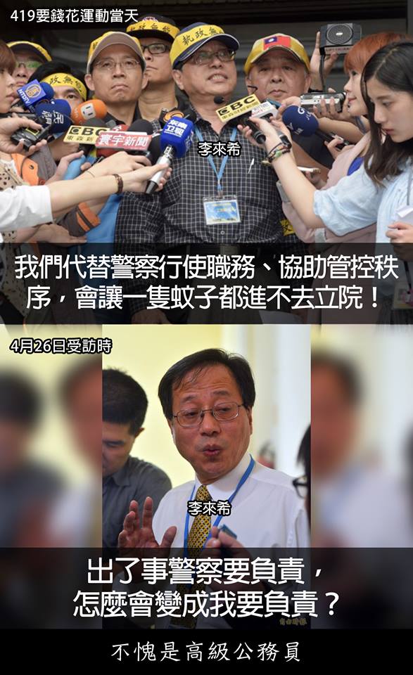 4月19日 李來希說: 「我們代替警察行使職務、協助管控秩序,會讓一隻蚊子都進不去立院。」 4月26日 李來希說: 「出了事警察要負責,怎麼會變成我要負責?」 #感謝來希示範何謂高級公務員 圖片來源: http://news.ltn.com.tw/photo/politics/breakingnews/2040697_1 http://news.ltn.com.tw/photo/politics/breakingnews/2048150_1 最新進度:李來希依搧惑他人犯罪法辦 http://news.ltn.com.tw/news/society/breakingnews/2050922