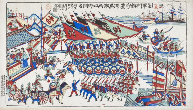 圖:1895年描述劉永福鎮守臺灣的版畫,代表了當時眾人對劉永福及黑旗軍的期待。(出自日本公文書圖書館)
