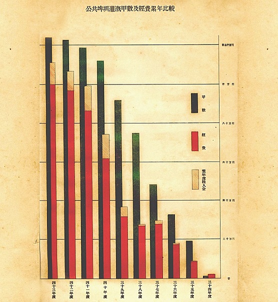 圖:1901年起至1910年之公共埤圳灌溉面積、經費成長圖(右至左)。