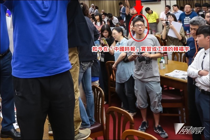 昨日《風傳媒》獨家揭露(報導一、報導二),立法院7月19日審查前瞻基礎建設預算時,發生藍綠爭執,爆發「水球大戰」;《中國時報》「實習生」「韓福宇」(見下圖),在未配戴任合證件的情況下,被該報其他採訪的記者夾帶進入立法院,擔任攝影角色,跟國民黨立委一起拿起水球,攻擊民進黨立委,導致藍、綠黨團都要追查他的身份。《風傳媒》更說,韓生還請同往的張姓男學生與李姓女學生幫忙拍照留念。