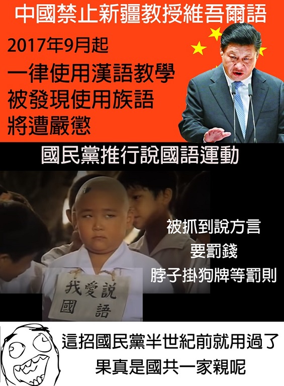 要滅族最簡單的方式就是毀壞其語言,中國規定自2017年9月開始,新疆校園全面禁止使用維吾爾語。 這根本抄國民黨的嘛!國民黨早在1956年就推行「說國語運動」,口號「語言不統一,影響民族團結」,強調說國語才是愛國。 #國民黨不妨全員滾出台灣去中國引領風潮 #啊已經去很多了 毀壞語言則滅其族/新疆校園9月全面禁止維吾爾語 http://www.peoplenews.tw/news/4a6877fc-c7cf-4cc6-a48f-f1281e96ed12