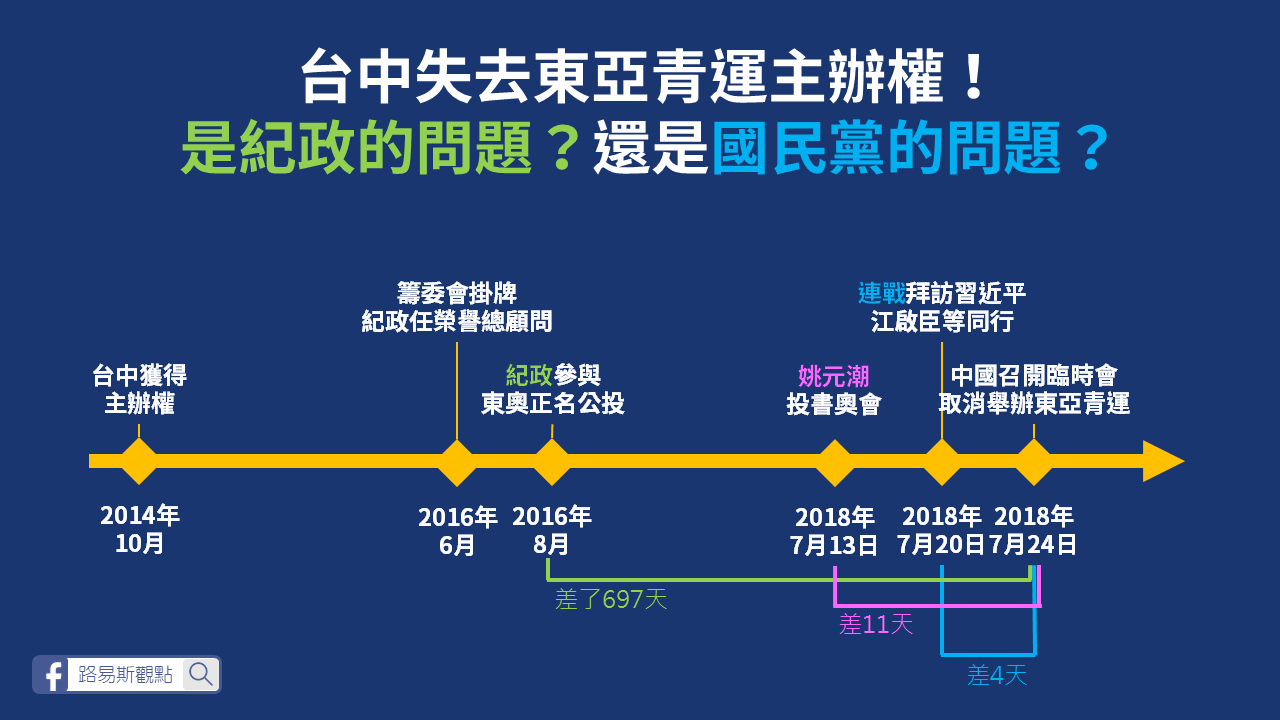 理事會開臨時會取消台中的主辦權計算天數,紀政投入正名公投運動到24日,經過697天;姚元潮投書奧會經過11天;連戰訪中回國後僅有4天。到底是紀政的問題?是姚元潮問題?還是國民黨的問題?