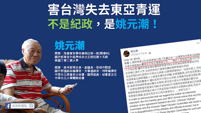 姚元潮身為軍方背景理應投入軍事相關活動,但卻藉由外語專長霸佔中華奧會相關職缺,難怪網友大批,這樣的人砍了年金實在合情合理,姚元潮身為一個軍人希望做是能敢做敢當,不是關閉了臉書就沒這回事。