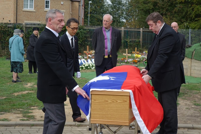 英國老兵費茲派翠克葬禮20日在英國里茲舉行,完成他以中華民國國旗覆棺的遺願後,在墓地安葬。(中央社)