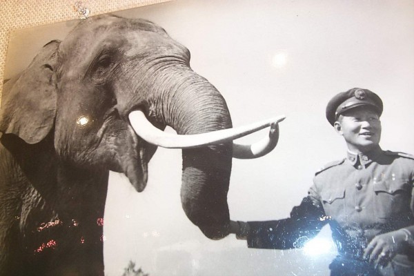 已故孫立人將軍當年遭總統蔣介石認定叛變予以軟禁,圖為孫立人將軍生前與大象林旺合照。(記者陳維仁翻攝,羅超群提供照片)
