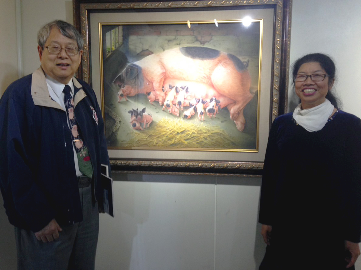 今天下午,畫家太太的老師與同學組成的畫會有個聯展開幕,在台北的吉林國小藝廊;她展出的是一幅「家是一窩豬」,畫中有一隻躺著的母豬和一群吸奶的豬仔,還有三隻吸飽了在一旁玩耍。對尖尾而言,任何一件和豬有關的東西都具有「致命的吸引力」,當然欣然前往。其實更不能錯過的原因是,她之所以選了這個主題,正是因為上次我們在她畫室看到一幅得獎的「黑面琵鷺」畫作,脫口說出:「如果畫的是一群黑毛豬就更好了。」想不到她接受挑戰,果然以這幅豬畫再次獲獎。