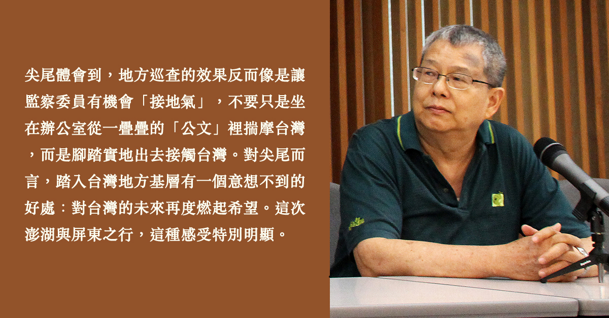 這一週過得特別快,因為週一與週二進行地方巡查,走訪澎湖與屏東兩個偏遠的縣份。這個行程是依照〈監察法施行細則〉的規定,將所有監察委員編為10組,分派到全國各縣市,每年度做兩次地方巡查,主要行程大致包含兩個部份:一是就預先選定的施政議題聽取縣政簡報,並參訪縣內特定地區或單位;另一是接受當地民眾陳情,說難聽一點,就像以往的「欽差大臣」代表皇帝巡訪民瘼。這兩個「節目」都好像是監委代表「朝廷」在督導「地方」的施政,這是尖尾剛就任時的認知,所以很不想去;但漸漸尖尾體會到,地方巡查的效果反而像是讓監察委員有機會「接地氣」,不要只是坐在辦公室從一疊疊的「公文」裡揣摩台灣,而是腳踏實地出去接觸台灣。對尖尾而言,踏入台灣地方基層有一個意想不到的好處:對台灣的未來再度燃起希望。這次澎湖與屏東之行,這種感受特別明顯。
