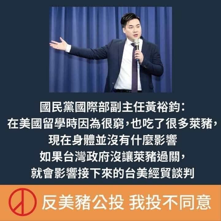 昨天在公投說明會上,國民黨代表林主任說,明知禁萊豬會讓台灣處境艱難,仍要動員通過。前幾天,國民黨黃主任說,如果台灣政府沒讓萊豬過關,就會影響接下來的台美經貿談判。