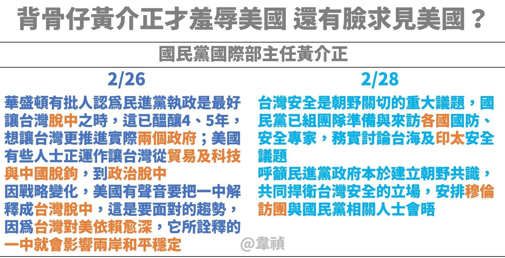 曾在扁政府任陸委會副主委的黃介正,現搖身成為國民黨國際事務部主任。而他不久前接受紅媒專訪,何其羞辱、攻擊美國?現在怎麼有臉求見美國?當大家都白癡嗎?