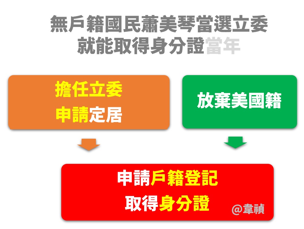 不過當時出入國移民法也規定,無戶籍國民只要擔任中央民代,就能定居。所以蕭美琴當時當選僑選立委後,只要辦理放棄美國籍,馬上就可以申請戶籍、獲得身分證。
