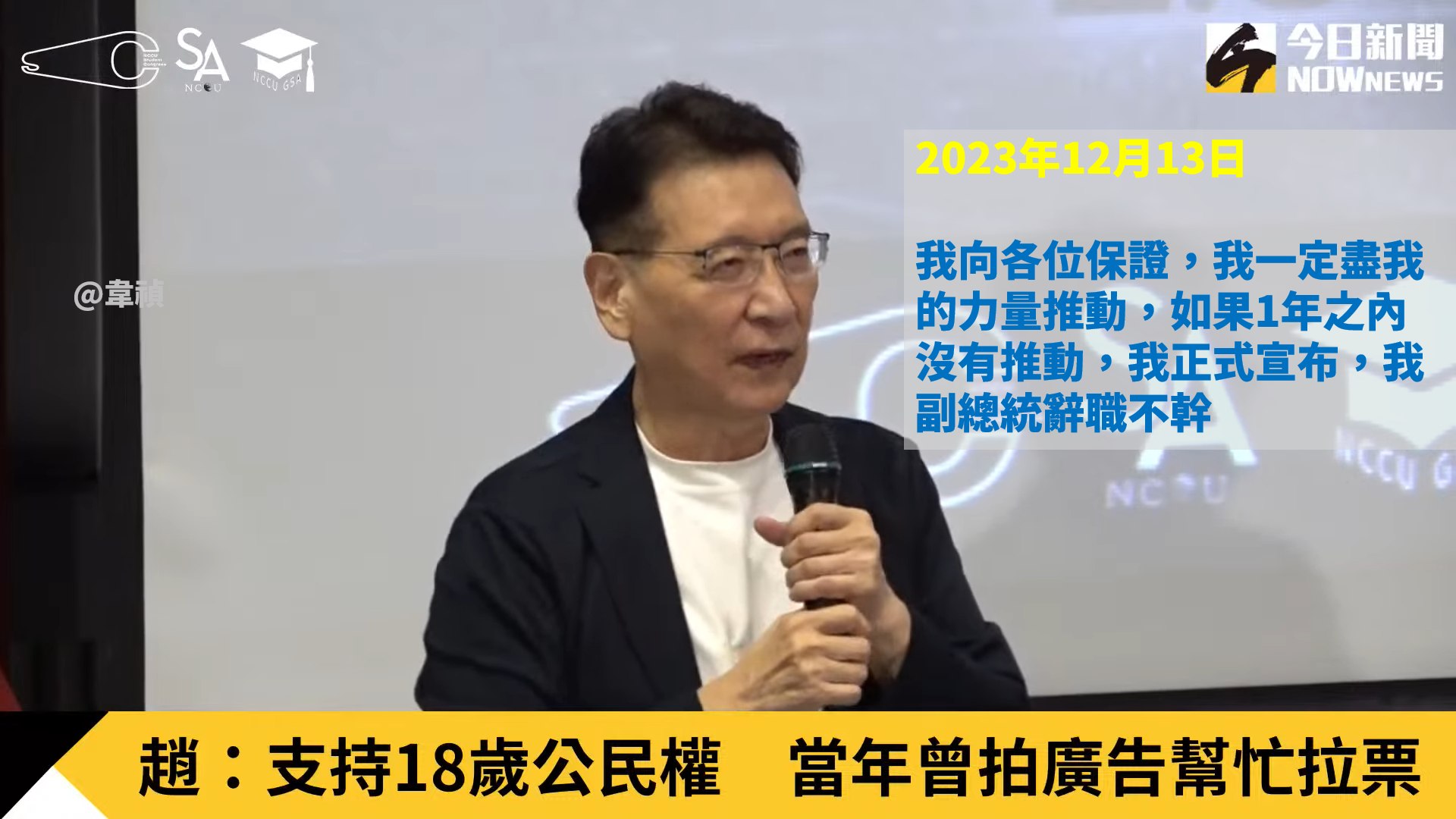 趙少康,馬上接招,秀出他去年他在中廣做的贊成18歲公民權的廣告,騙取學生的掌聲。趙少康還保證,一定盡力推動18歲公民權,1年之內沒有推動,正式宣布副總統辭職不幹了。