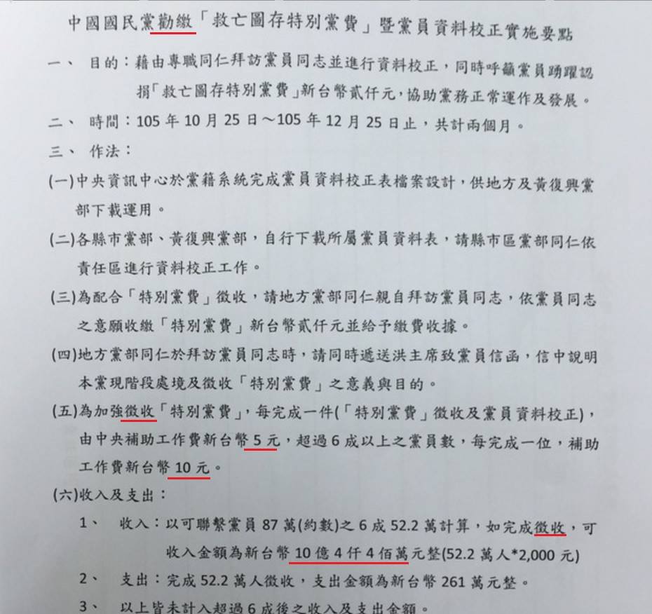 這個黨沒救了。 1.標題是"勸繳" ,內容卻變成 "徵收"、"加強徵收",貴黨執政那麼久,不知道"勸繳"和"徵收"的巨大差異嗎? 2.黨員87萬? 赤柱還在做夢嗎? 3.收2000元給5元抽頭,你當國民黨員吃素的? 4.捨近求遠找10億, 找連公、伯公、馬公、朱公就有40億啦!